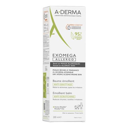 A-DERMAEXOMEGA ALLERGO Descrizione Balsamo emolliente. Il Balsamo emolliente Cosmetico Sterile lenisce la sensazione di prurito e aiuta a distanziare i picchi di sensazione di fastidio, riducendo gli arrossamenti della pelle secca a tendenza atopica. Testato su pelle allergica e su palpebre secche a tendenza atopica. La sua efficacia a 360° riduce inoltre la secchezza cutanea, rafforza la barriera cutanea e aiuta a riequilibrare il microbioma. Una formula ricca dalla consistenza ibrida che unisce la scorrevolezza di una crema e il nutrimento di un balsamo non grasso e non appiccicoso, per una tripla azione lenitiva con un'unica a...