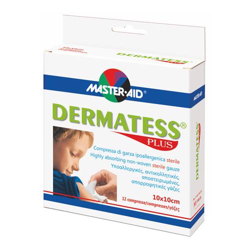 Vedi descrizione completa MASTER•AID DERMATESS PLUS Dispositivo medico CE 0373. Compressa di garza sterile in tessuto non tessuto con elevata capacità di assorbimento. Ipoallergenica, può essere utilizzata anche sulle pelli più delicate. Non si attacca alla ferita e, per un miglior utilizzo, è piegata su quattro strati. Utilizzabile anche per uso invasivo.